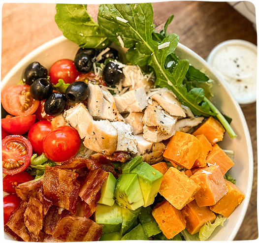 먹기 좋은 크기로 담아낸 올리브, 닭가슴살, 치즈, 아보카도, 베이컨, 토마토 본연의 맛을 살려 신선한 야채와의 조화가 강조된 샐러드